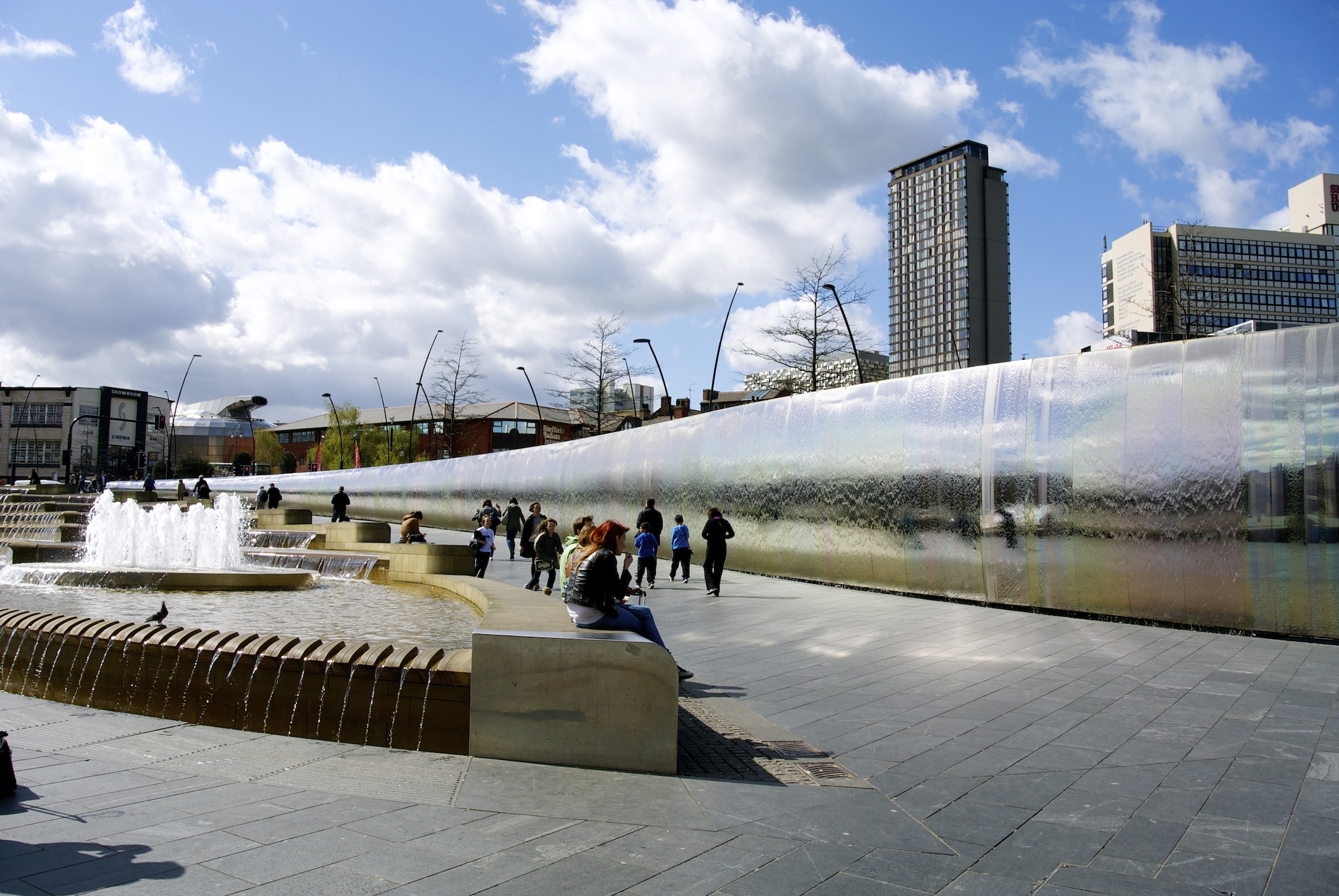 Sheffield has an amazing water feature outside the railway station in Sheaf Square called Cutting Edge which is very striking.