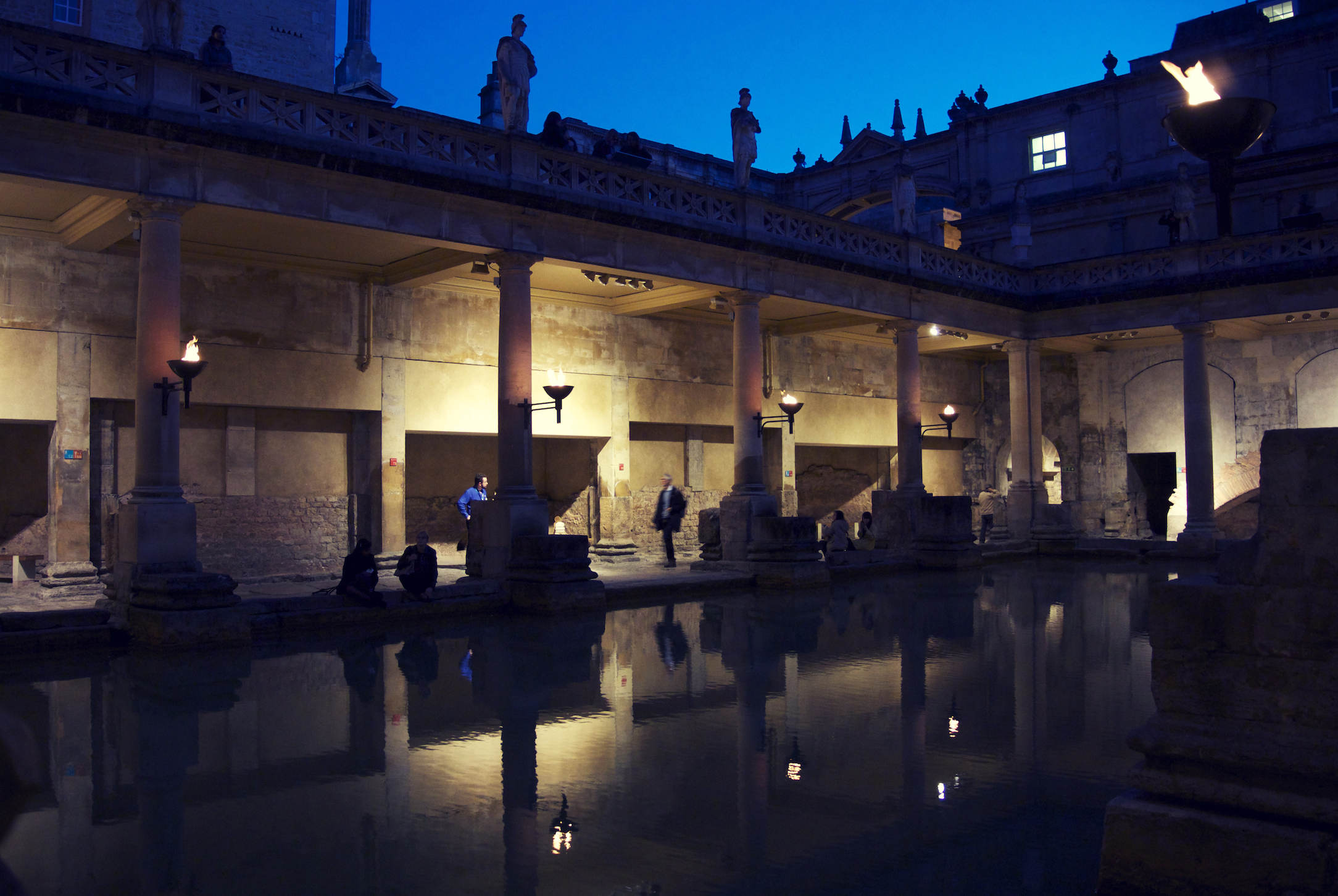 Roman Baths2We had walked passed the Baths earlier in the day and the queue was out the door, but at 7pm, we walked straight in and it was so great to walk around without the crowds.  The torches had already been lit as we entered and walked around the terrace.  As the sun went down, it just got more and more serene.  We went through the museum first of all and worked our way down – walking over the temple courtyard; seeing the Sacred Spring and the Spring overflow which was so warm, and then around the Great Bath itself.